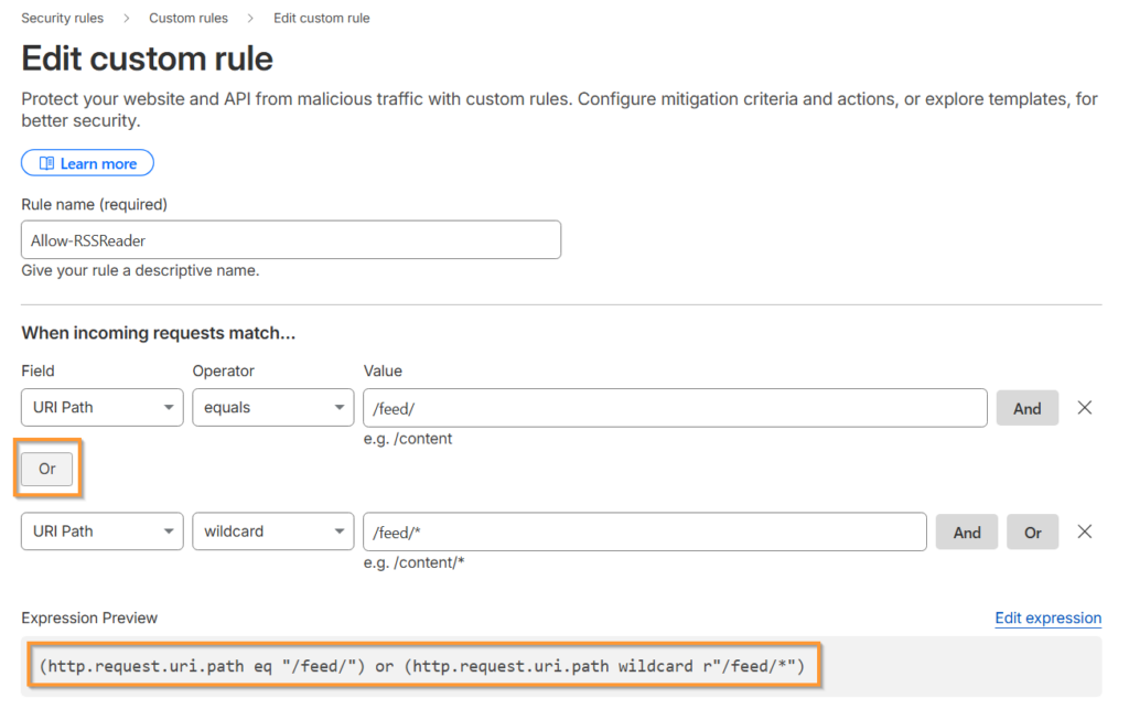 Sélectionnez le champ URI Path et ajoutez le chemin vers votre flux RSS, voici ce que j’ai fait pour être certain que ça match :