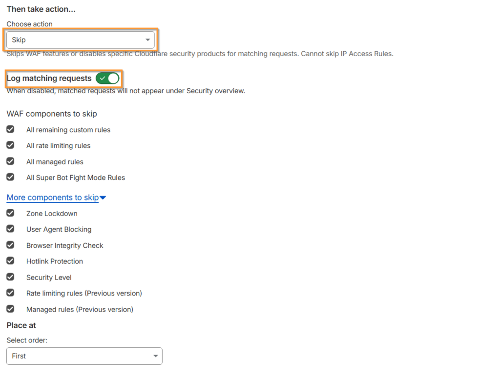 Plus bas dans la règle, activez l’exclusion complète de la protection de Cloudflare pour éviter tout blocage comme ceci :