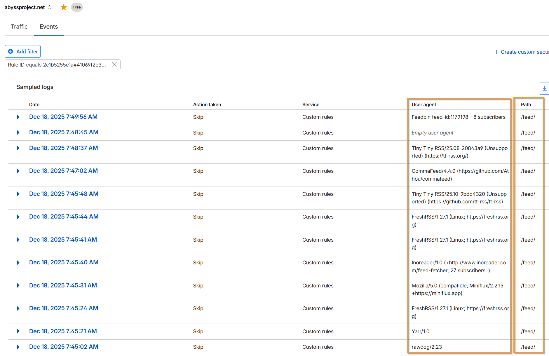 Après la remontée d’un lecteur, j’ai appris que Cloudflare bloquait les lecteurs de flux RSS (via les règles anti-AI / anti-BOT a priori).