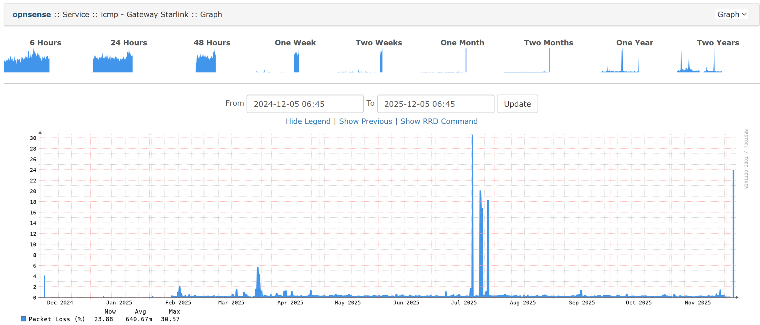 Comme on peut le voir sur le monitoring, j’ai eu assez peu de problèmes hormis des pannes mondiales Starlink (et l’entretien de mon infra ou le redémarrage automatique) :